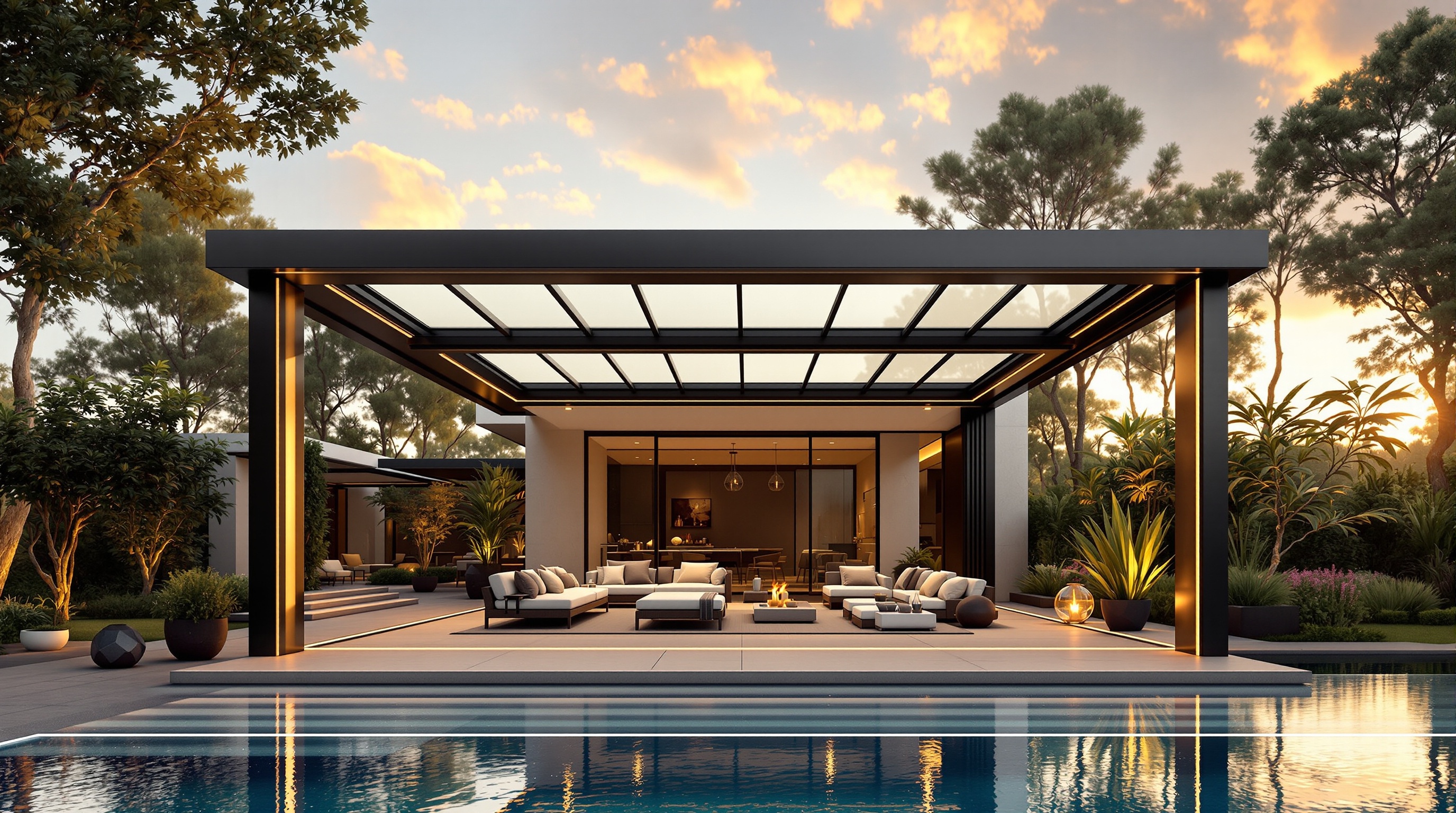 Hidrolik piston mekanizmalı modern pergola sistemi ile donatılmış villa terası